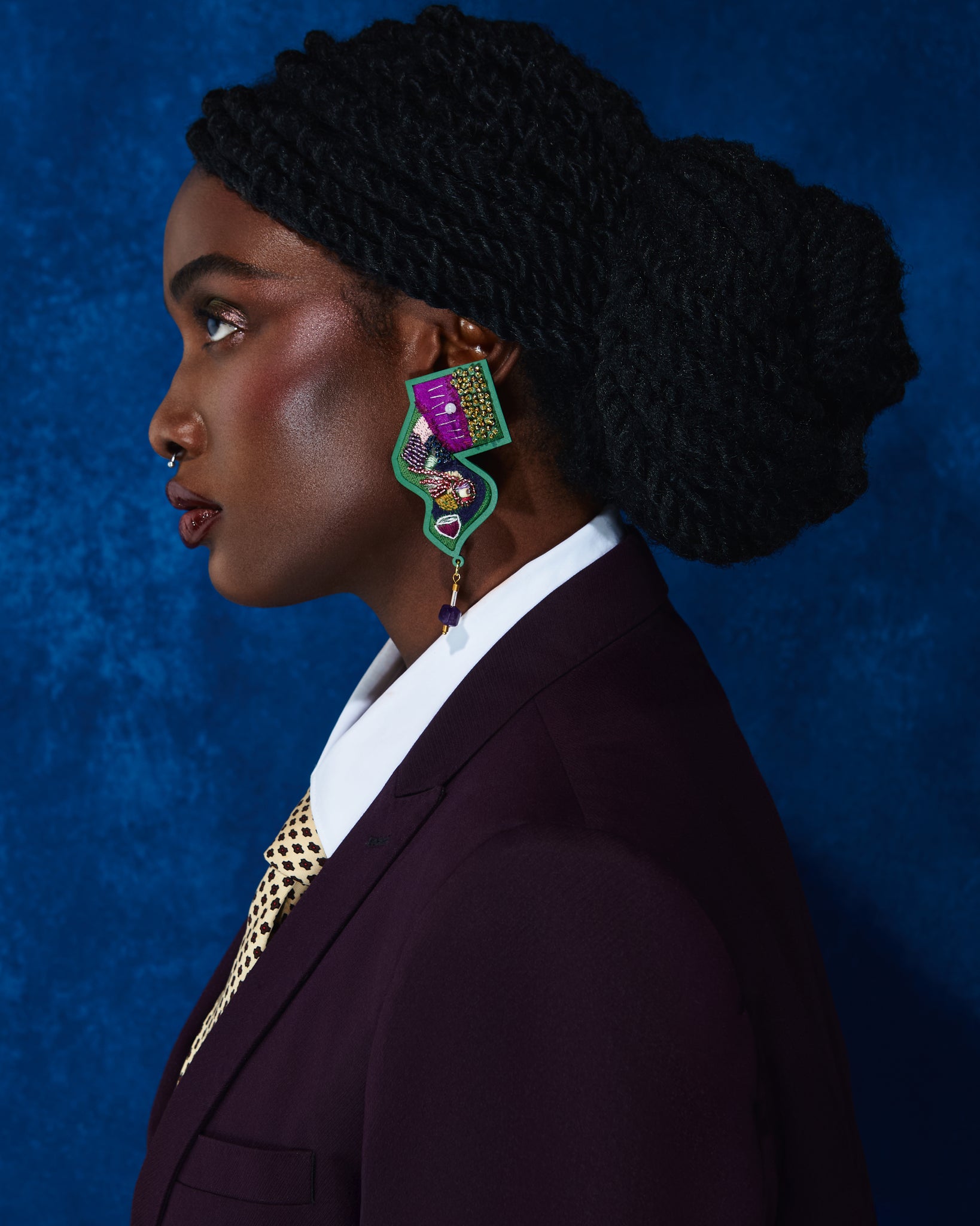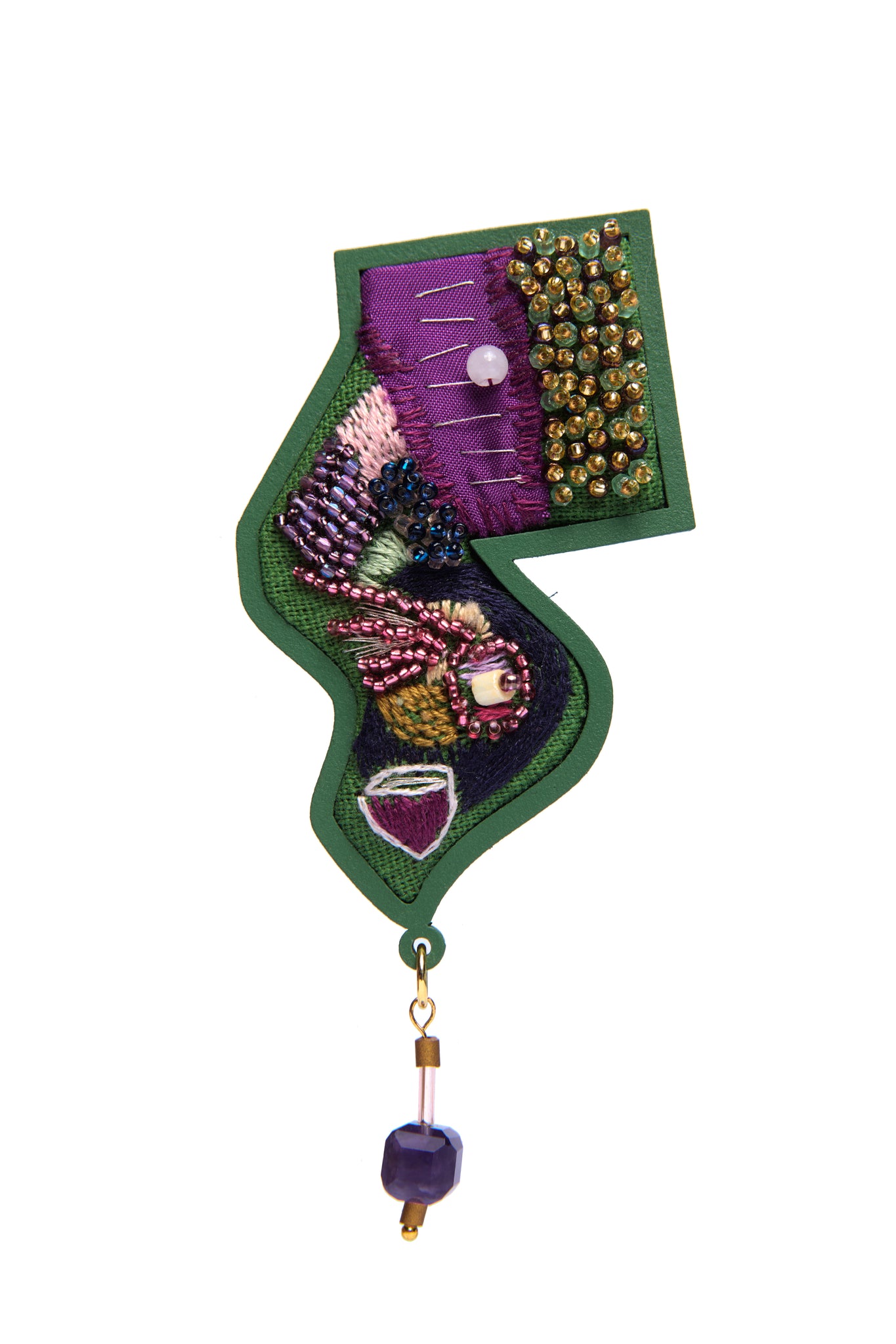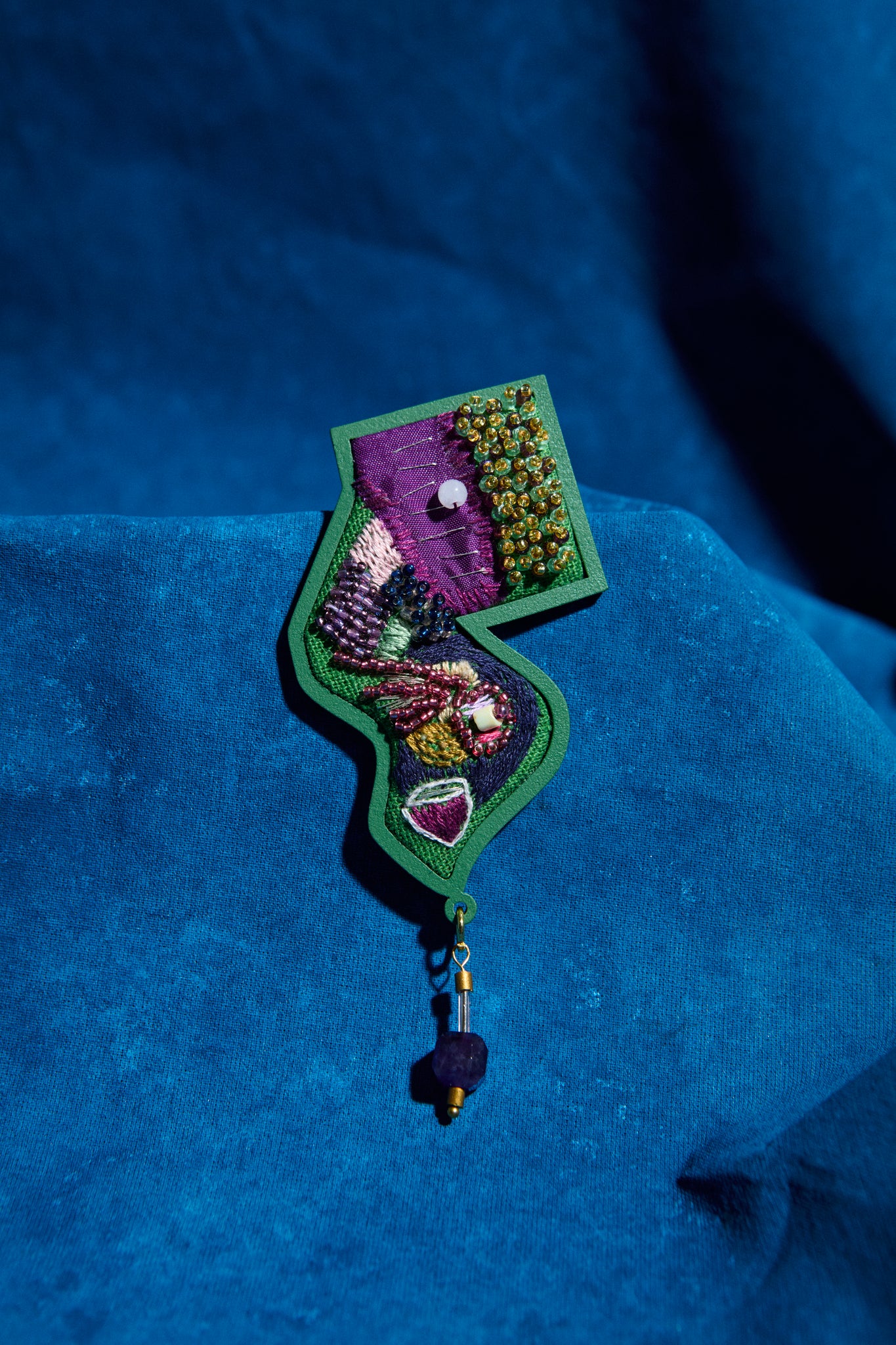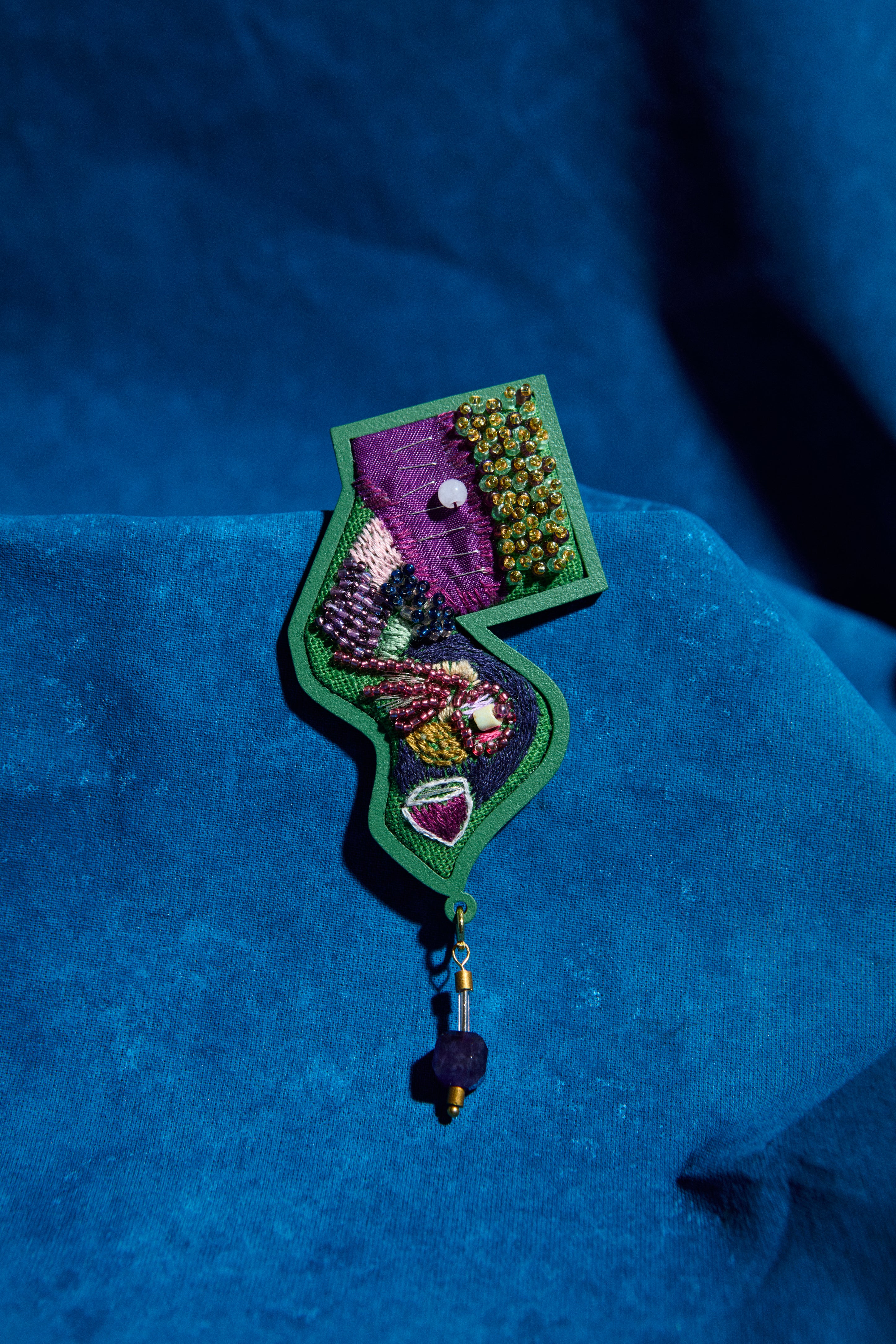 Brinco bordado em linho misto e tafetá com miçangas, canutilhos. quartzo e ametista