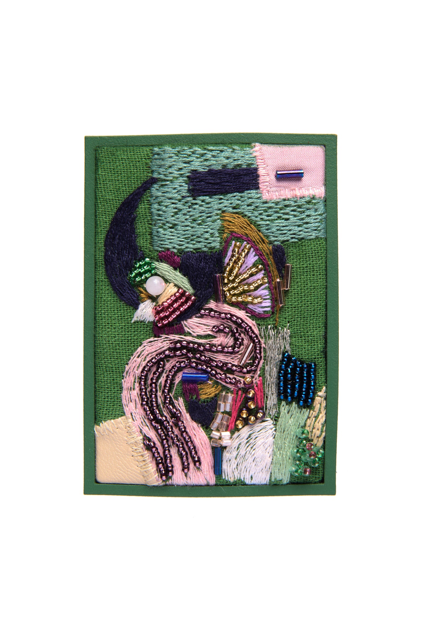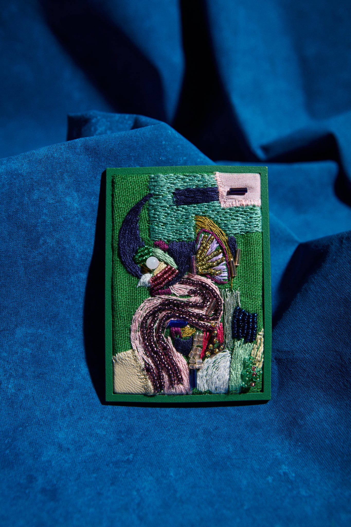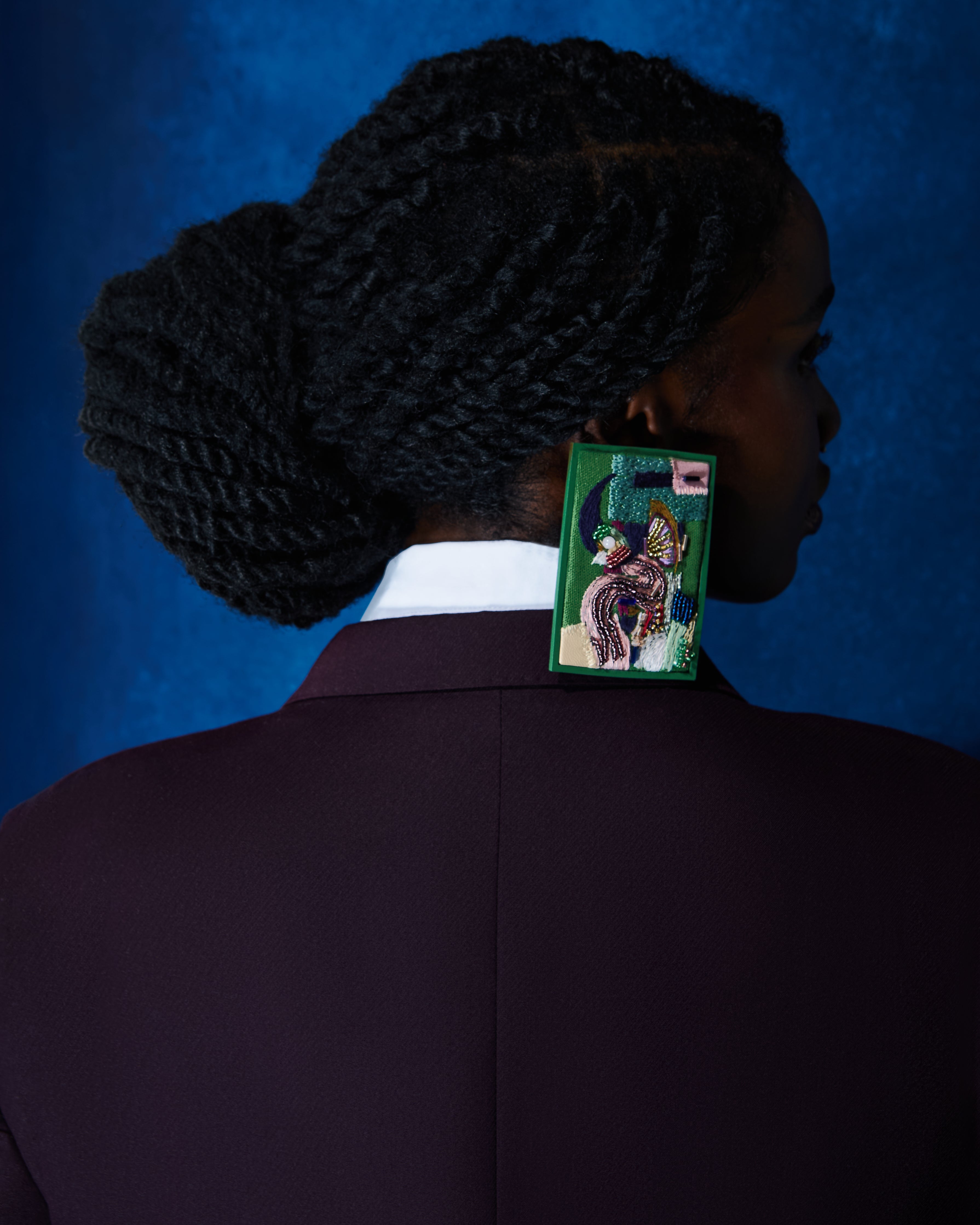 Brinco bordado em linho misto, couro sintético e tafetá com miçangas, canutilhos e quarzo.