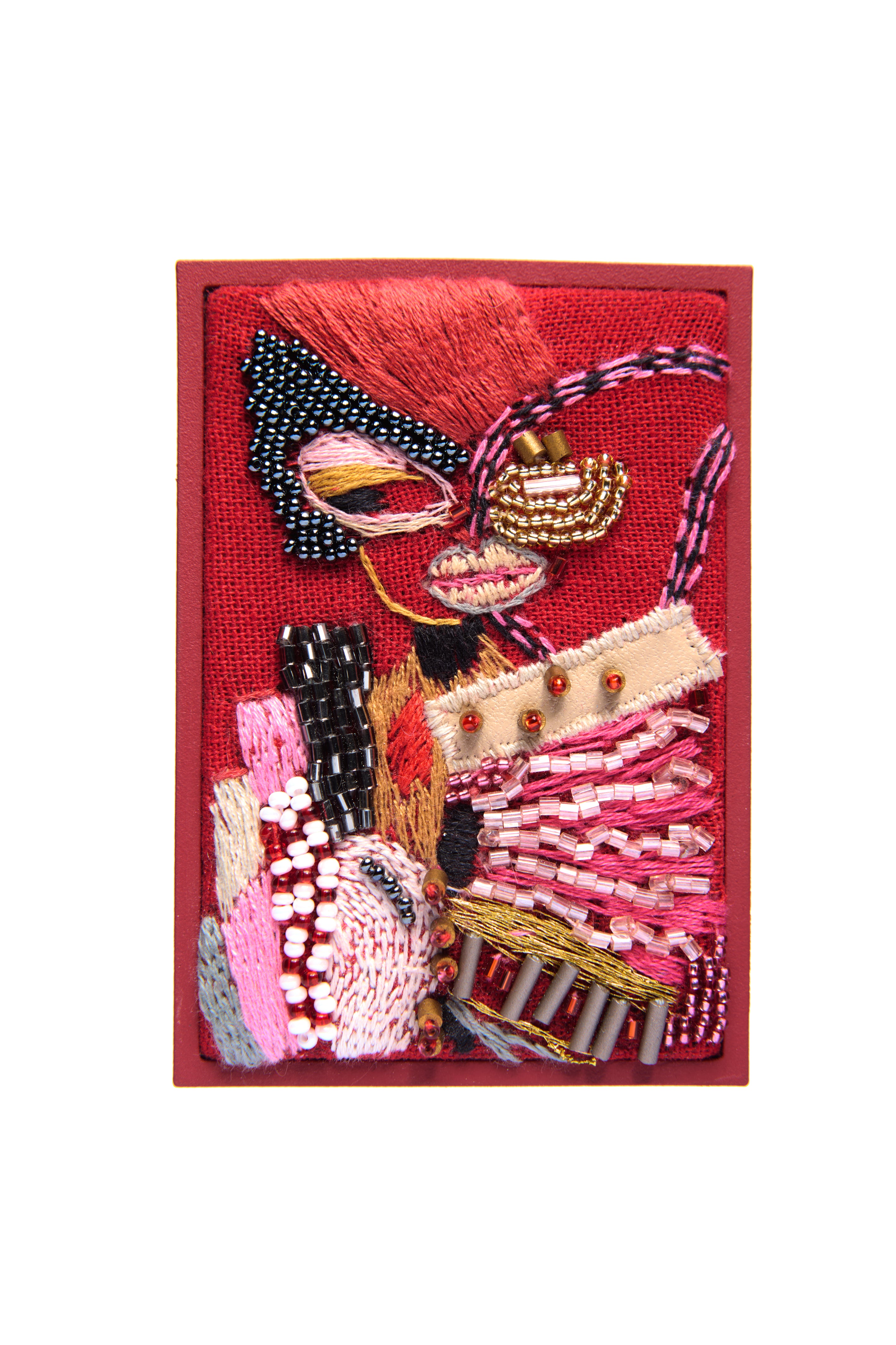 Brinco bordado em linho misto e couro sintético, com miçangas e canutilhos.