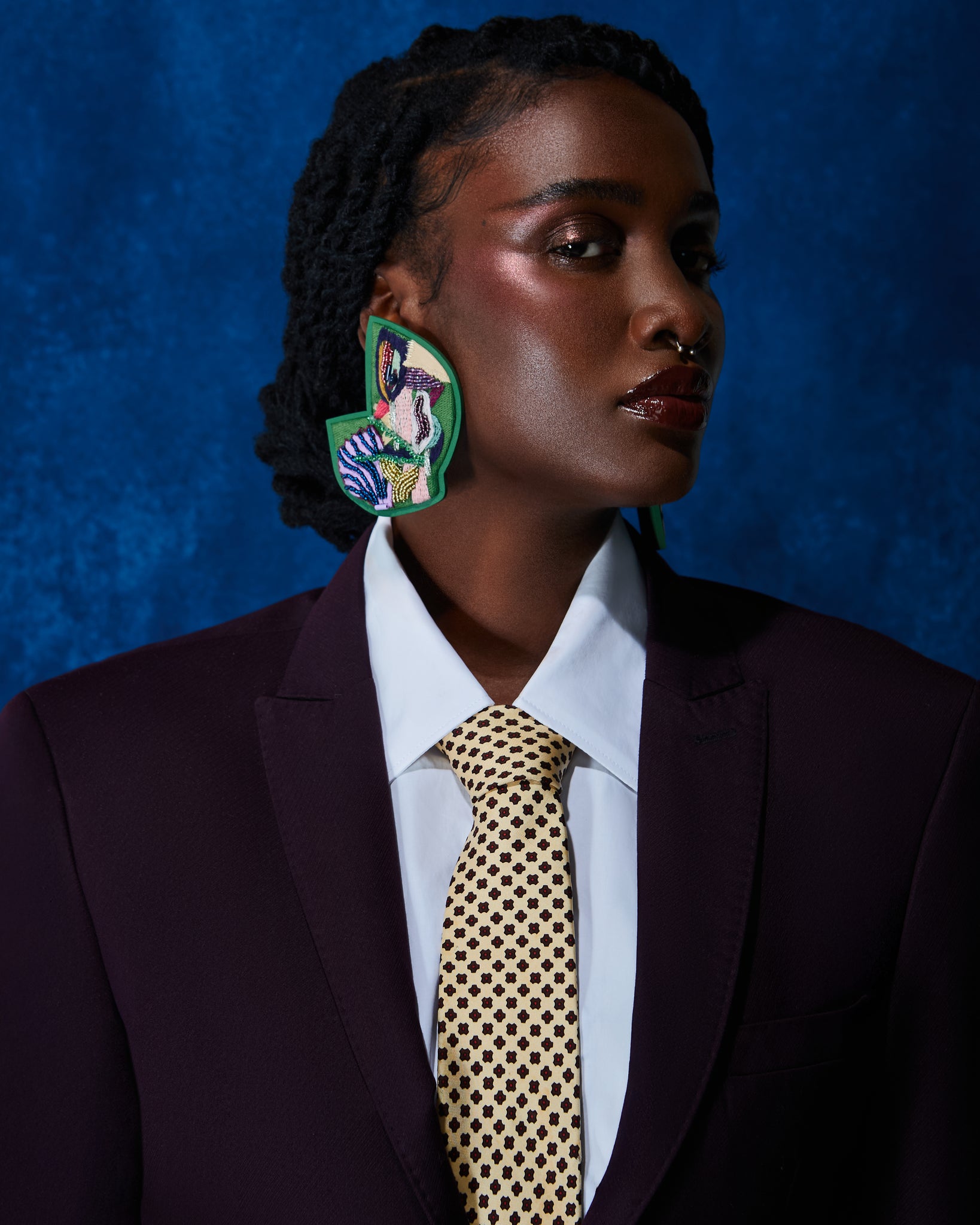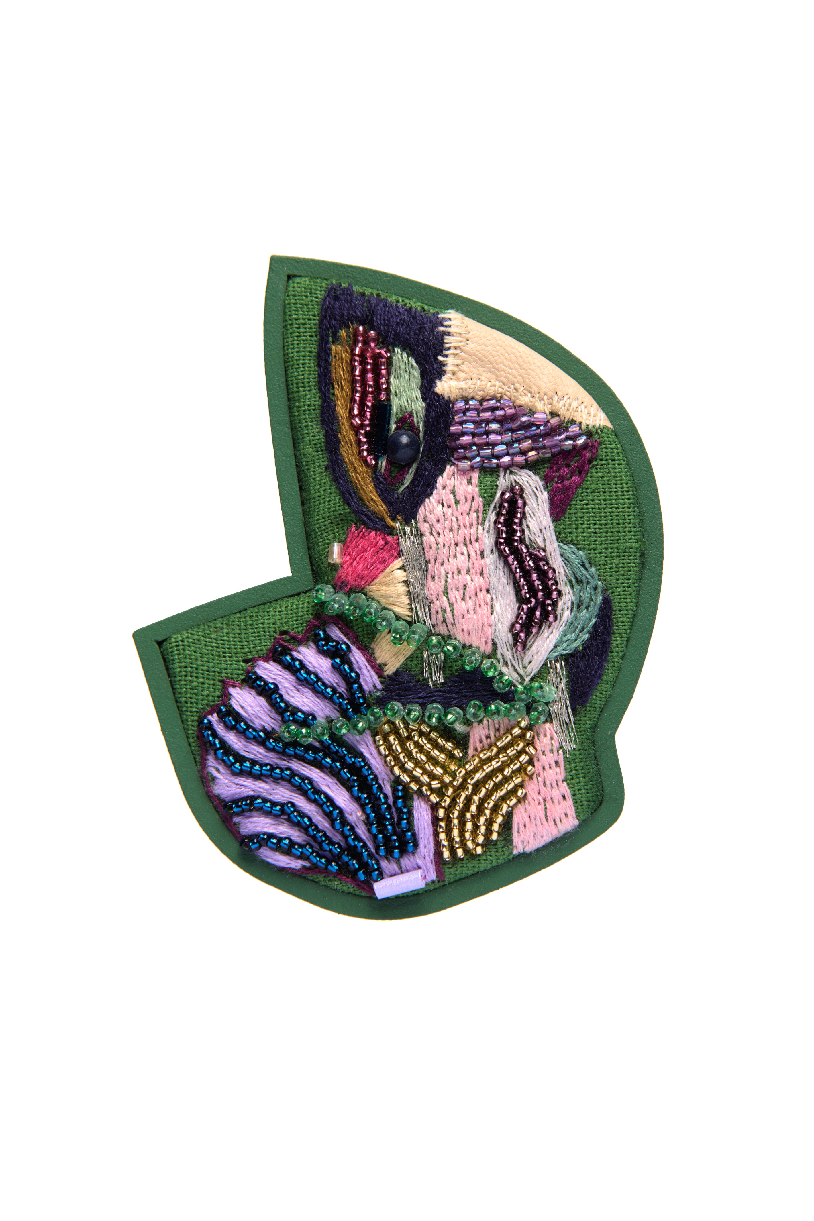 Brinco bordado em linho misto e couro sintético com miçangas, canutilhos e quartzó.