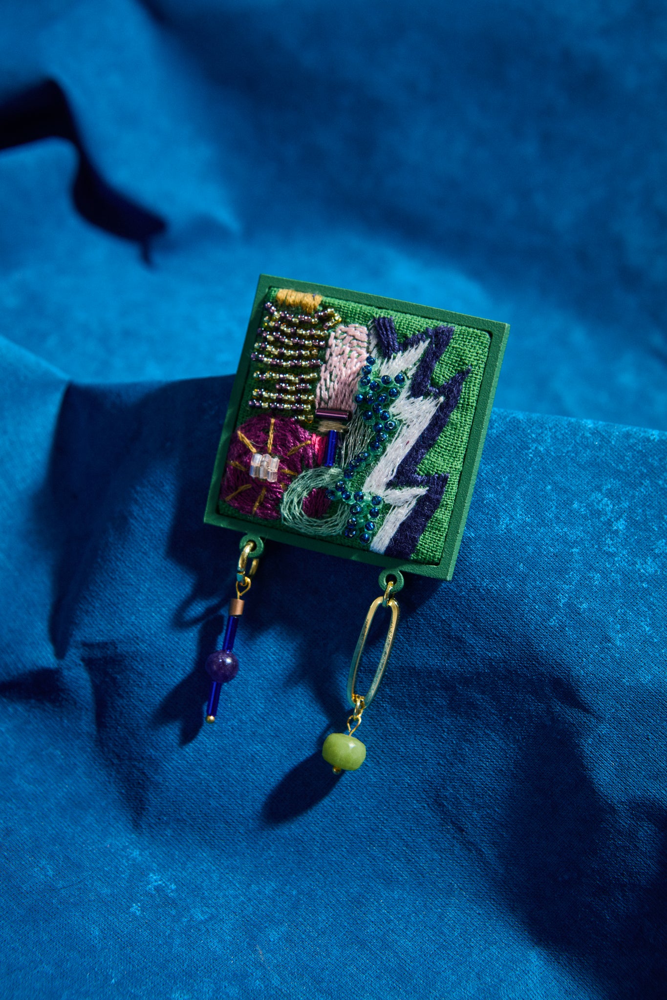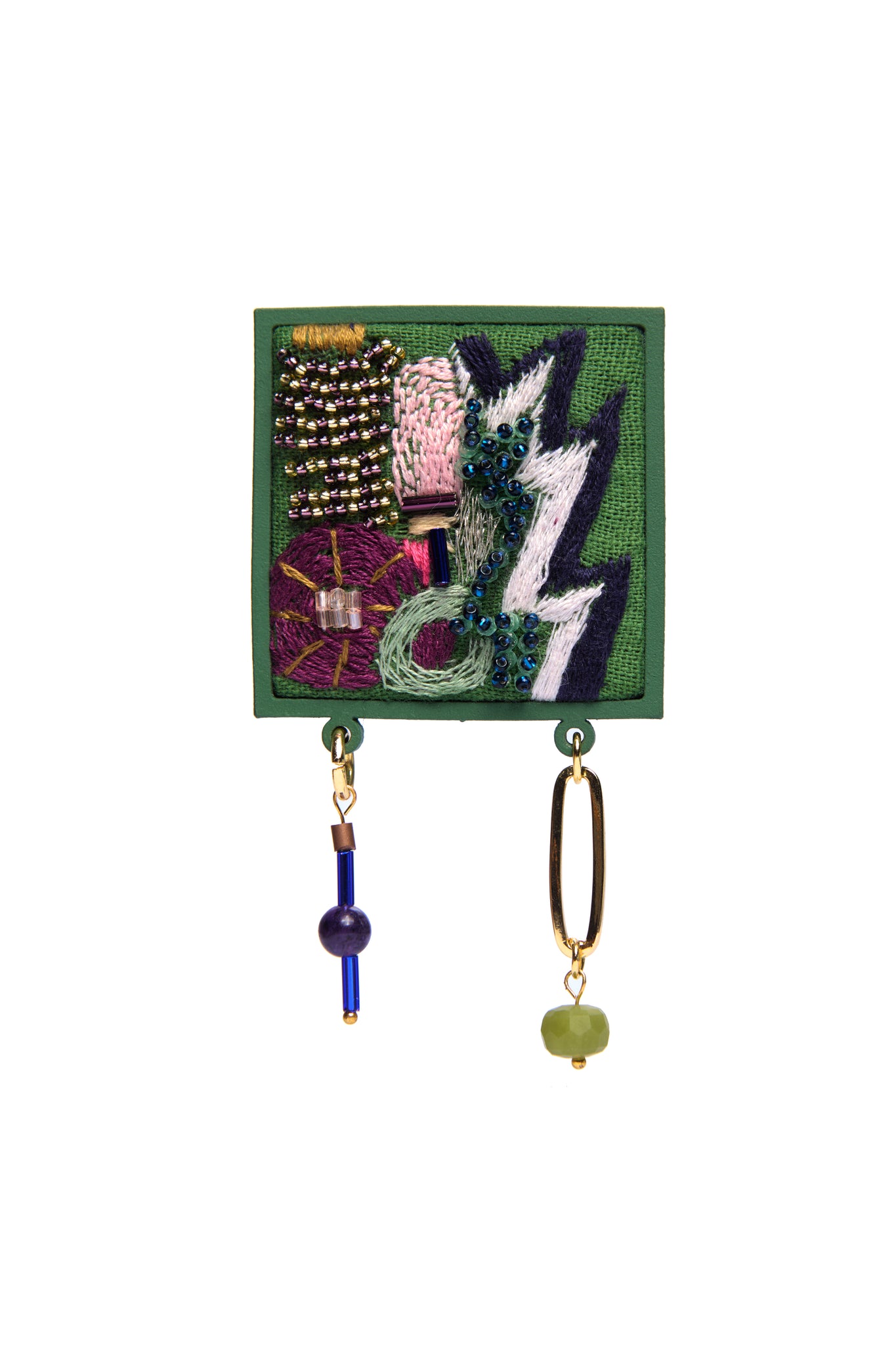 Brinco bordado em linho misto com miçangas, canutilhos, jade e jaspe.