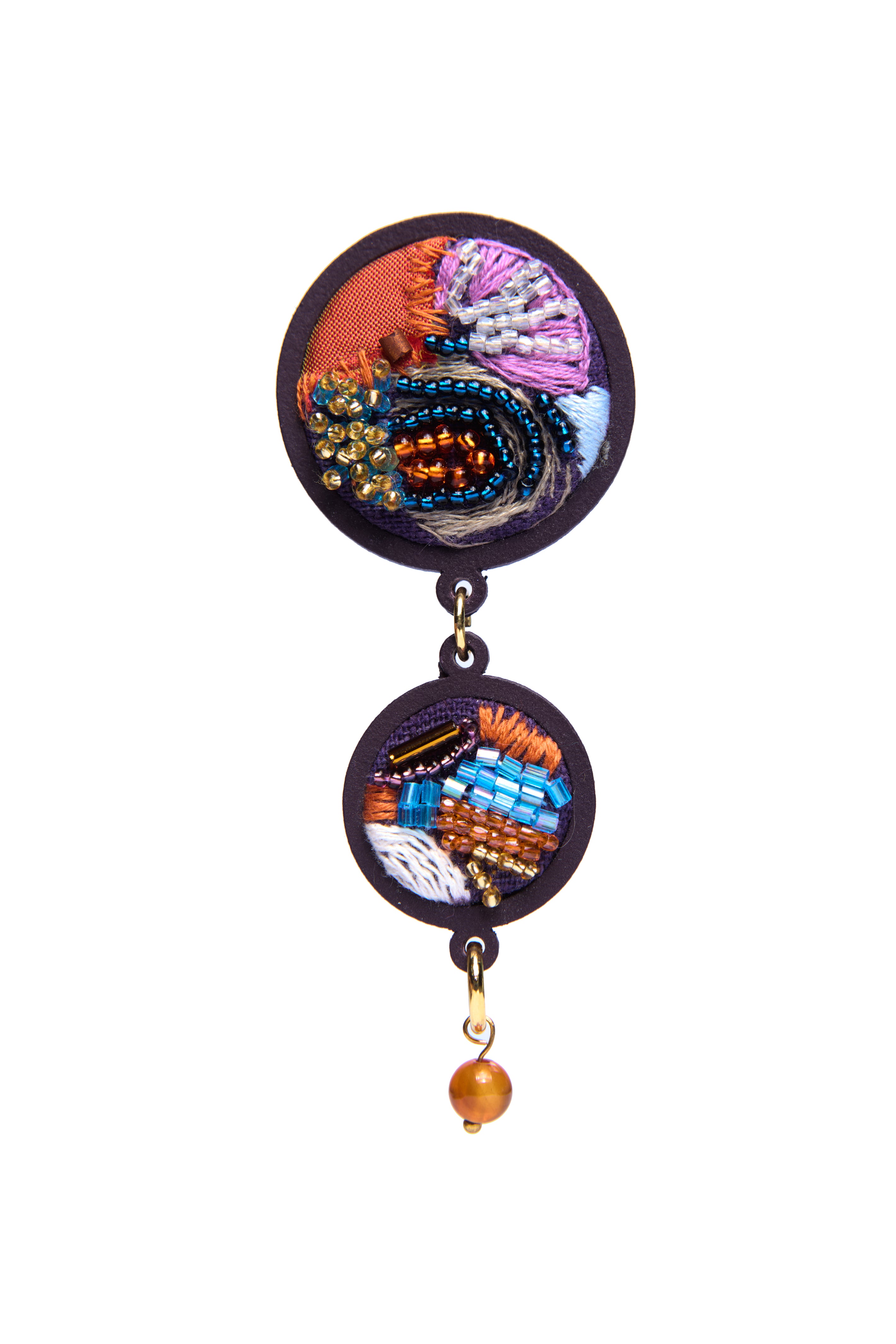 Brinco bordado em linho misto e tafetá com miçangas e ágata.