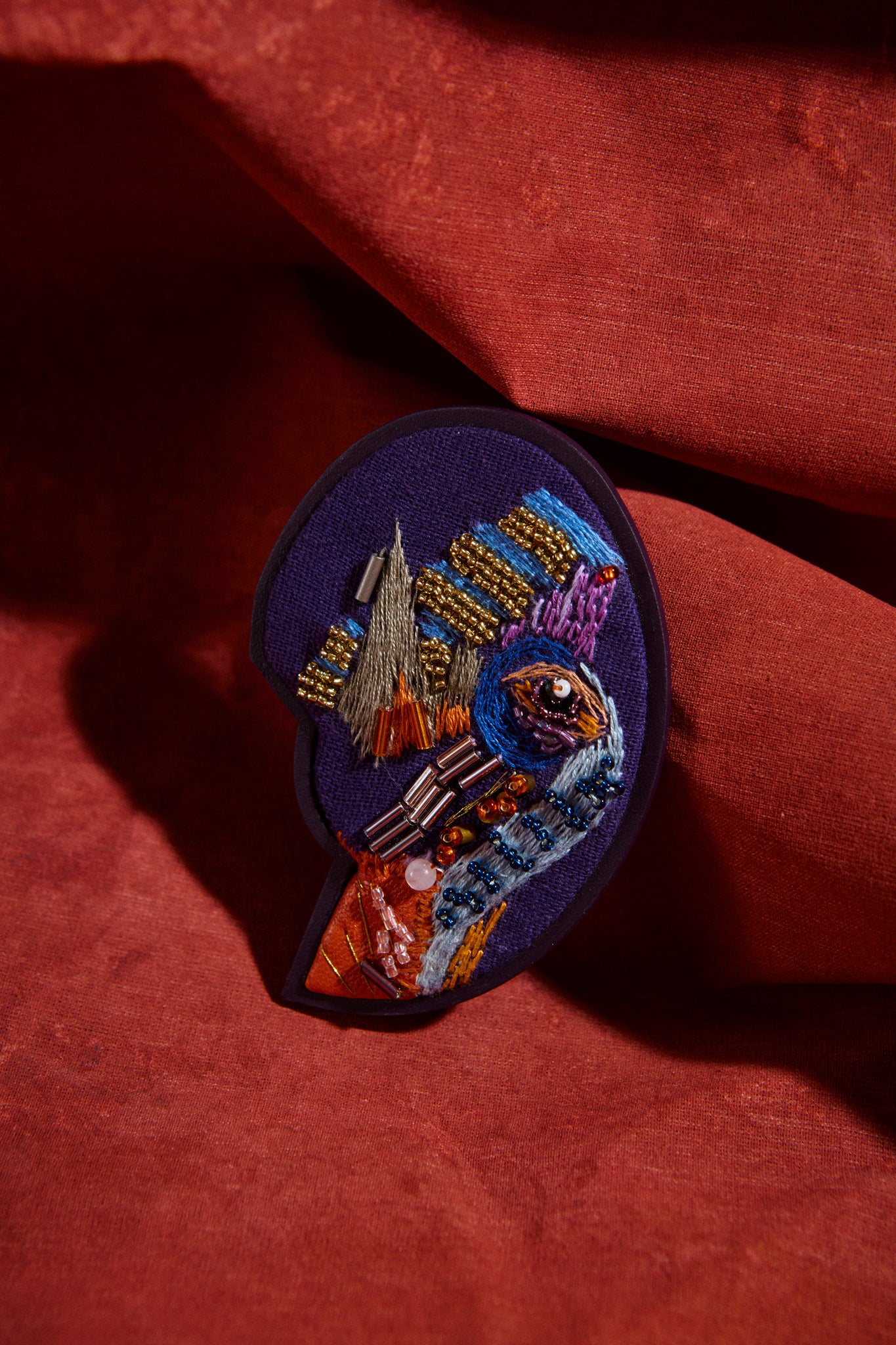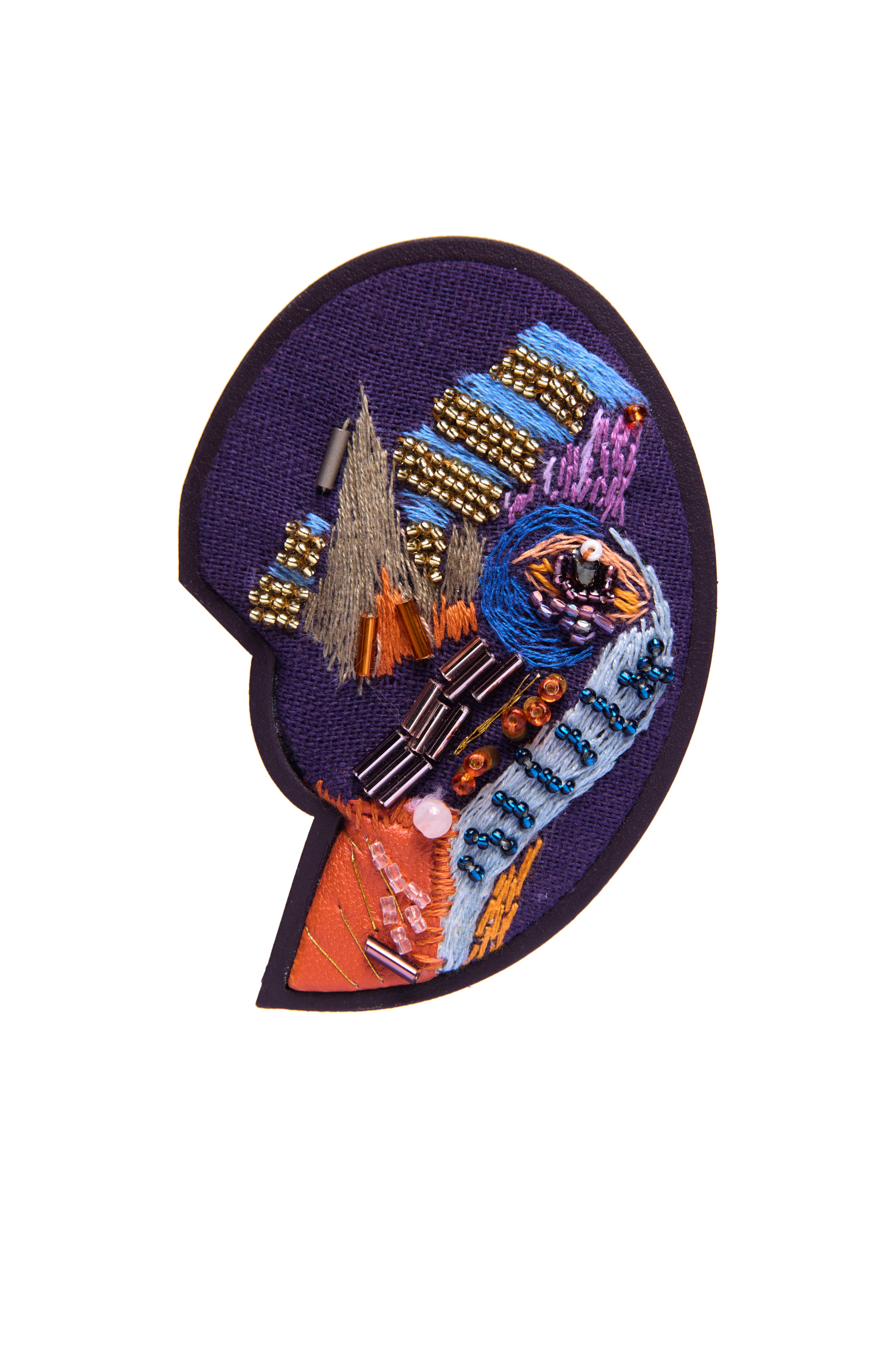 Brinco bordado em linho misto e couro sintético com miçangas, canutilhos e jade.