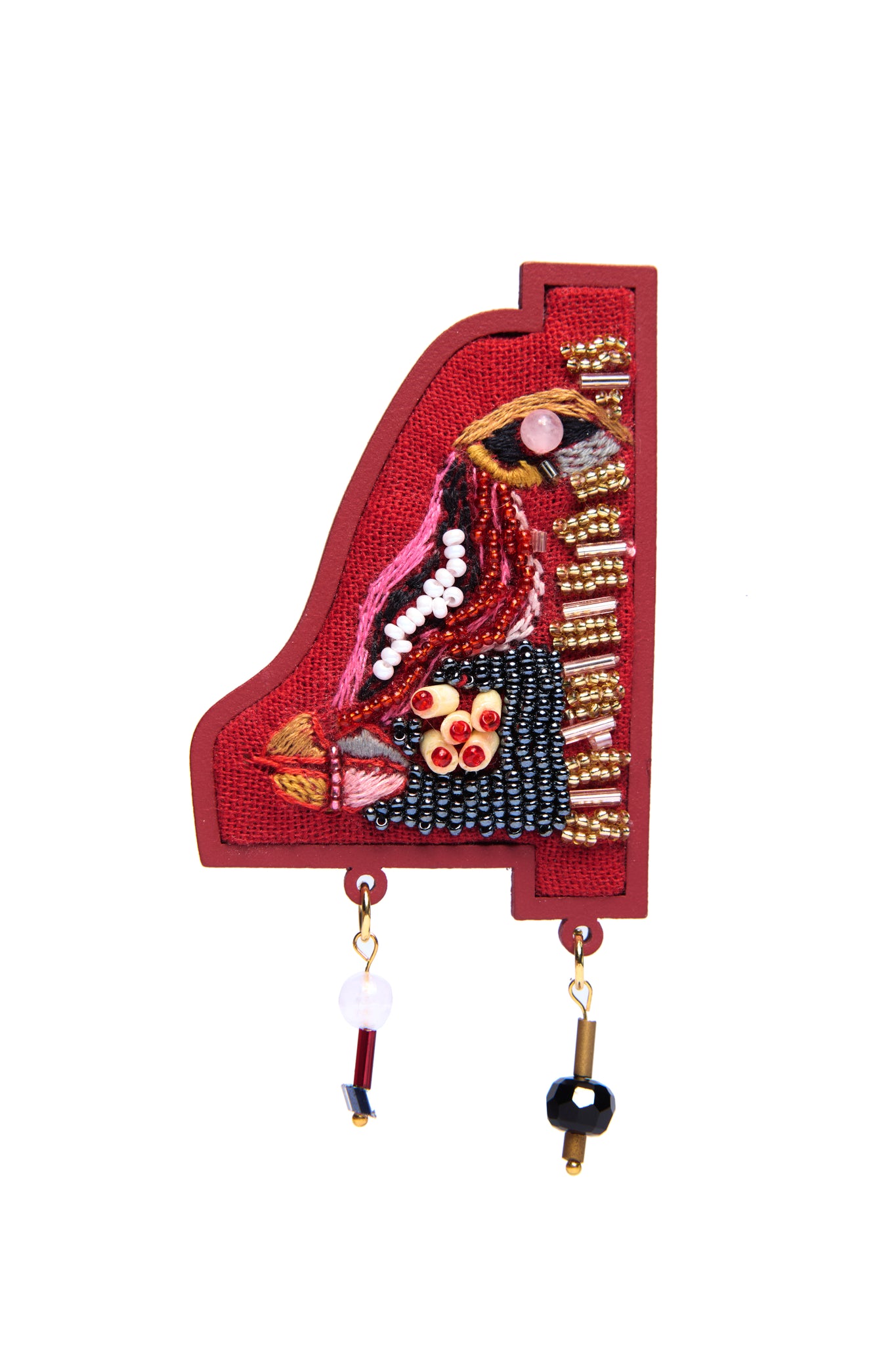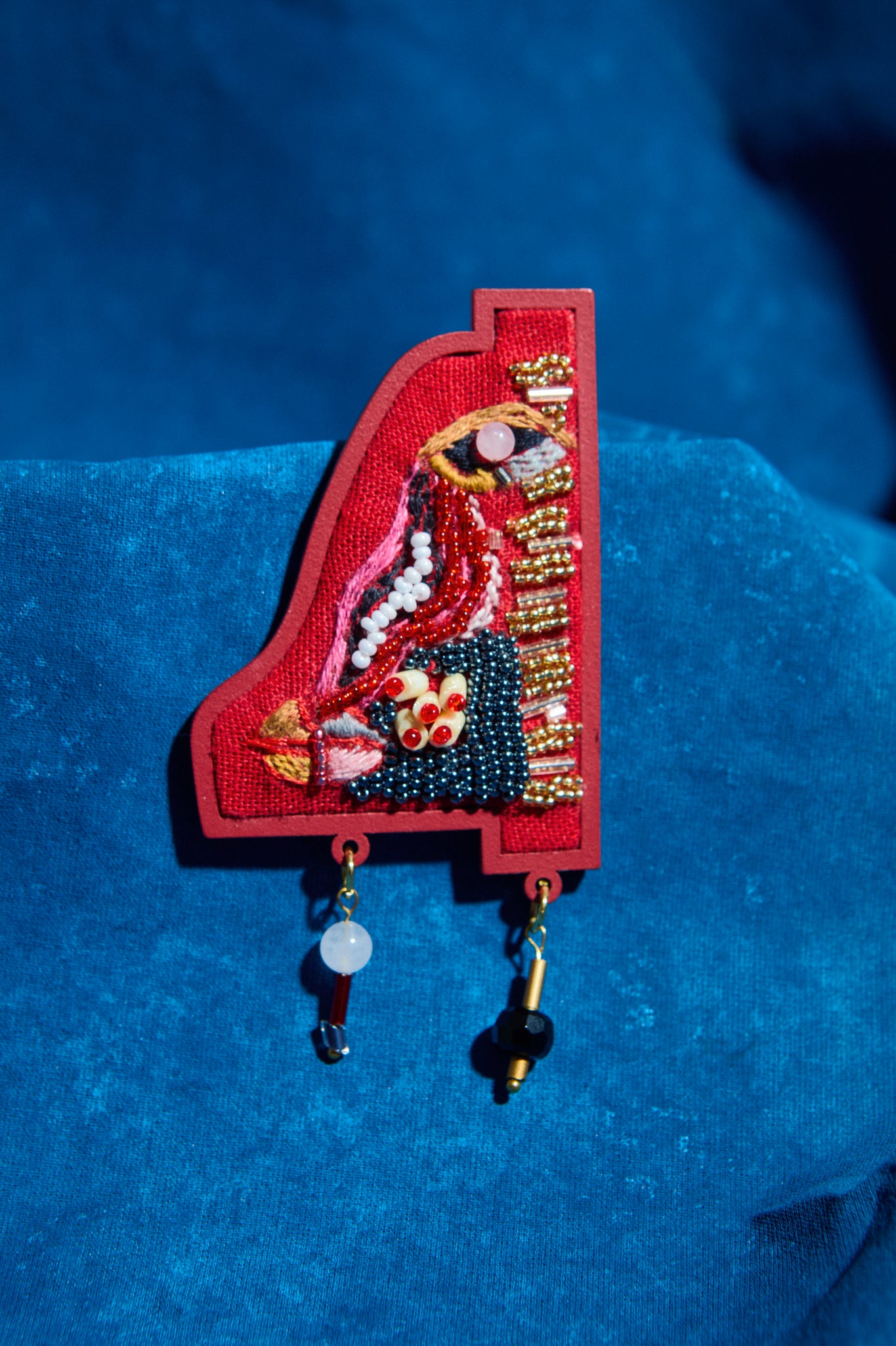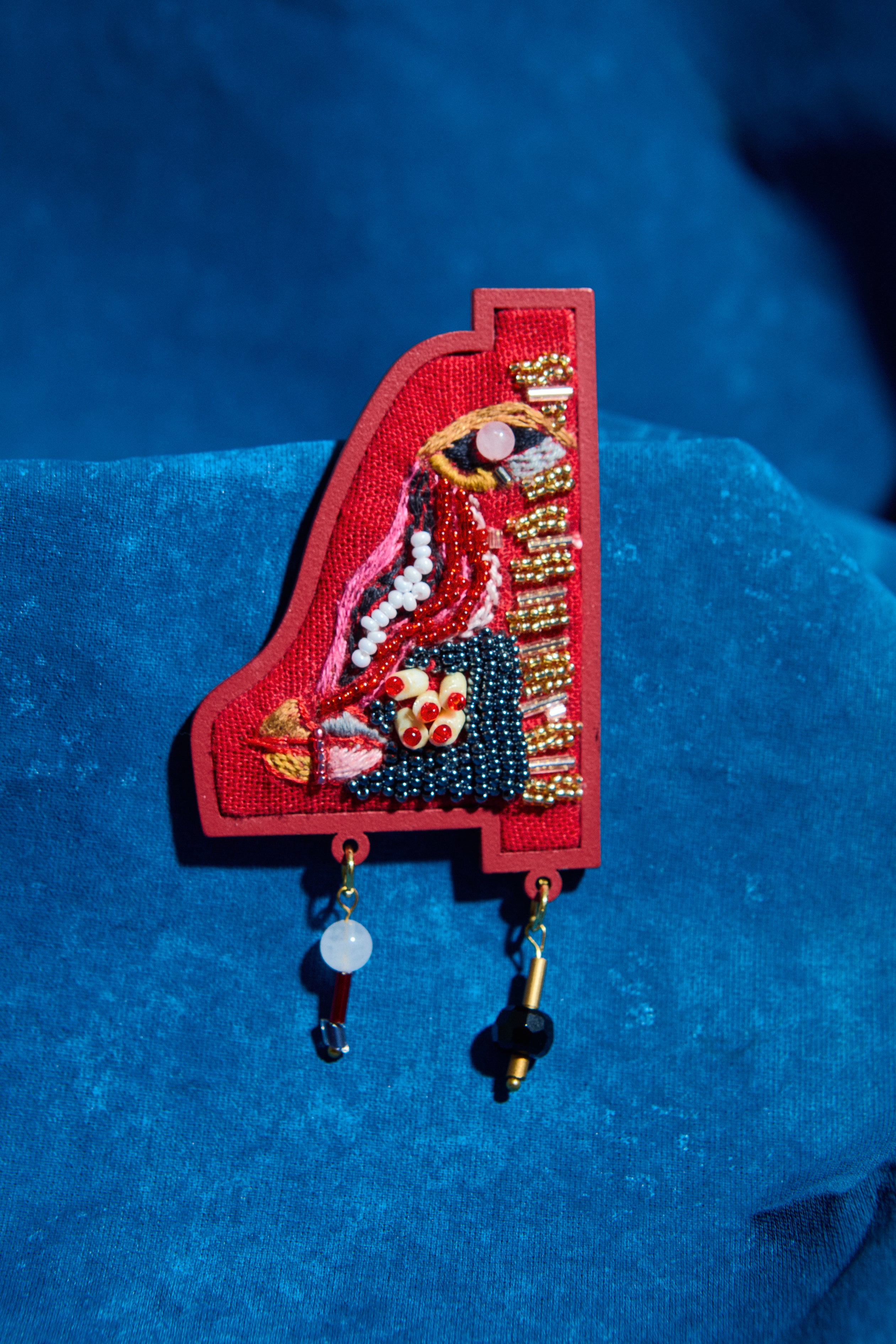 Brinco bordado em linho misto com miçangas, canutilhos, quartzo, jade e ágata.