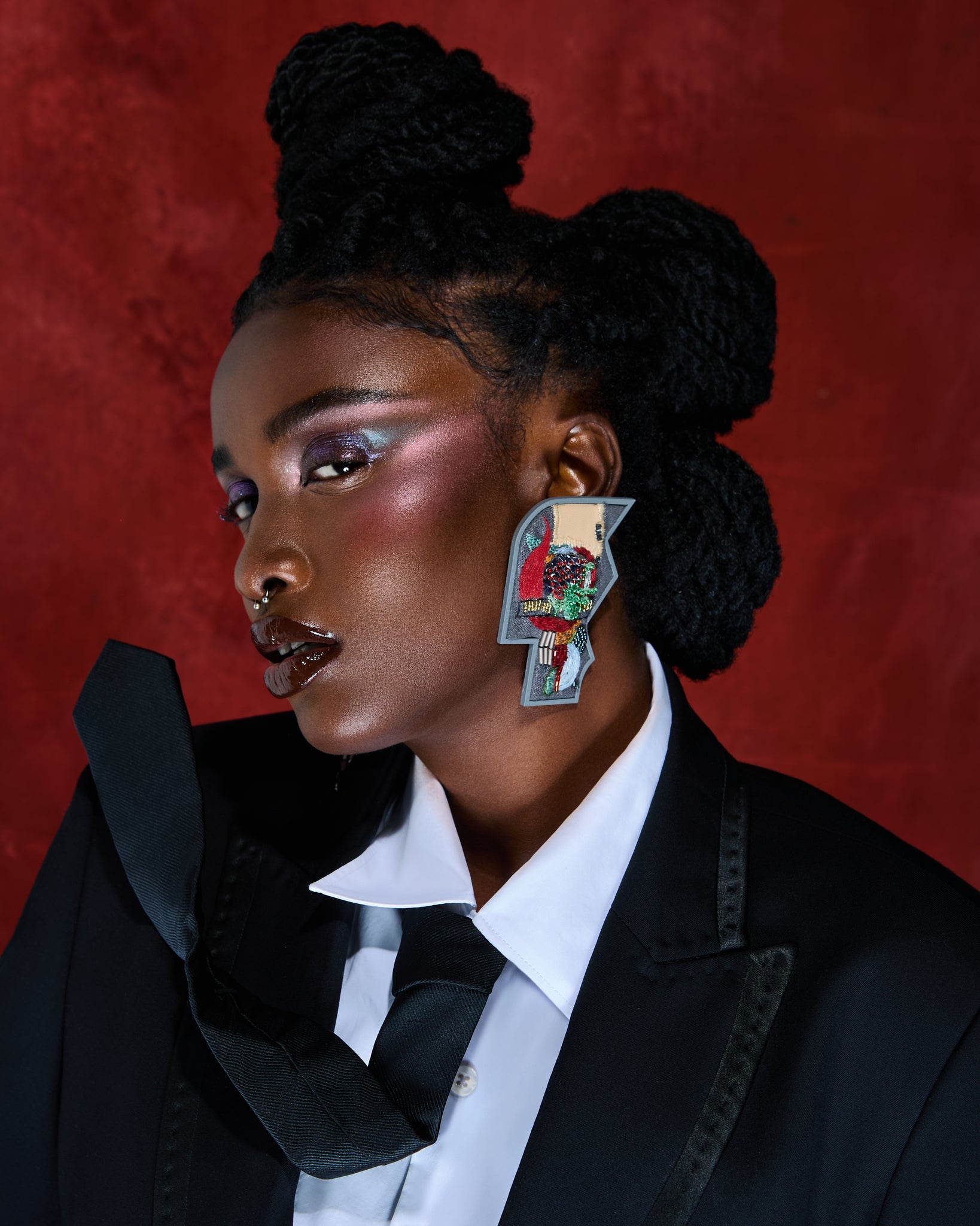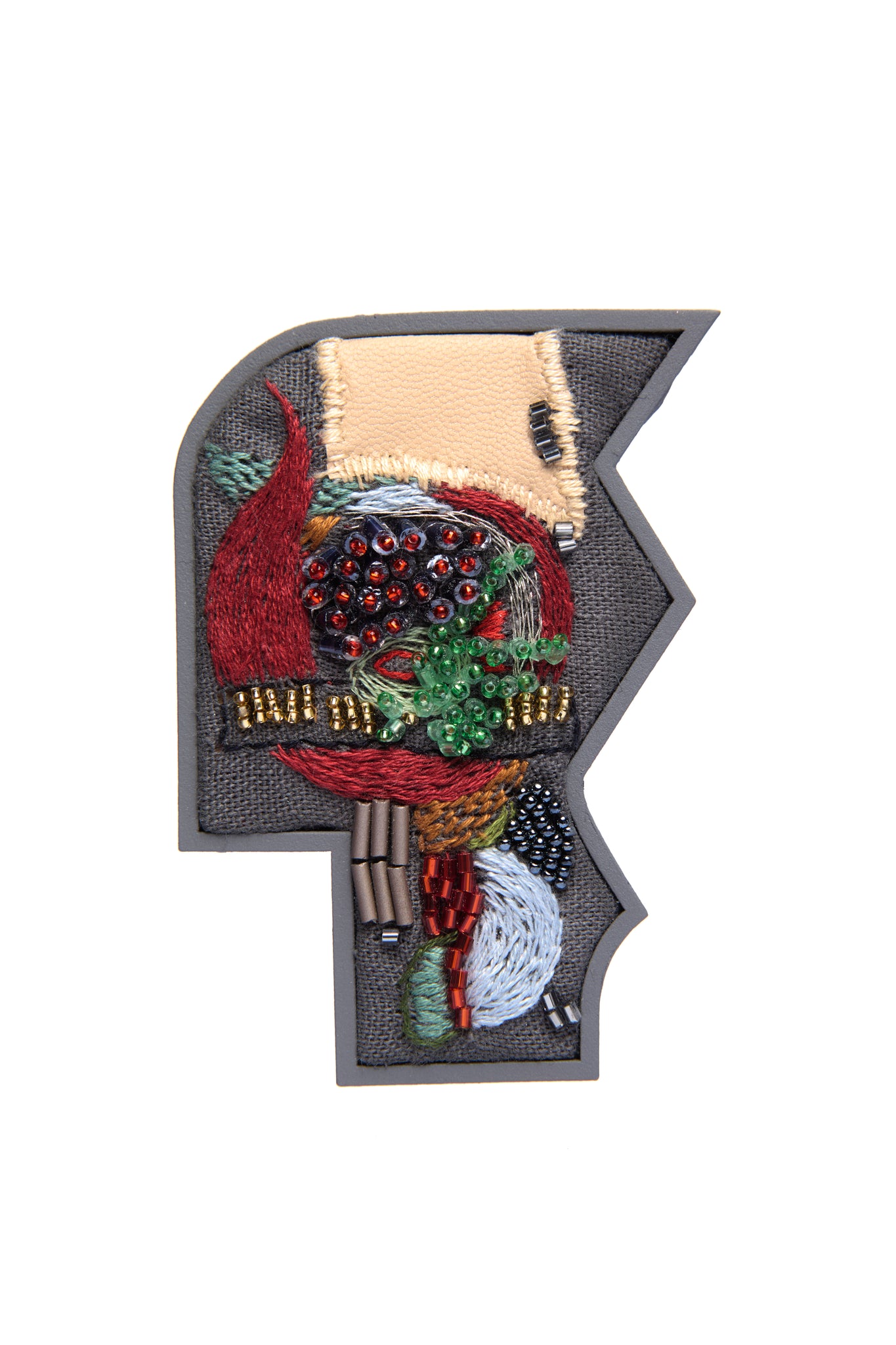 Brinco bordado em linho misto e couro sintético com miçangas e canutilhos.