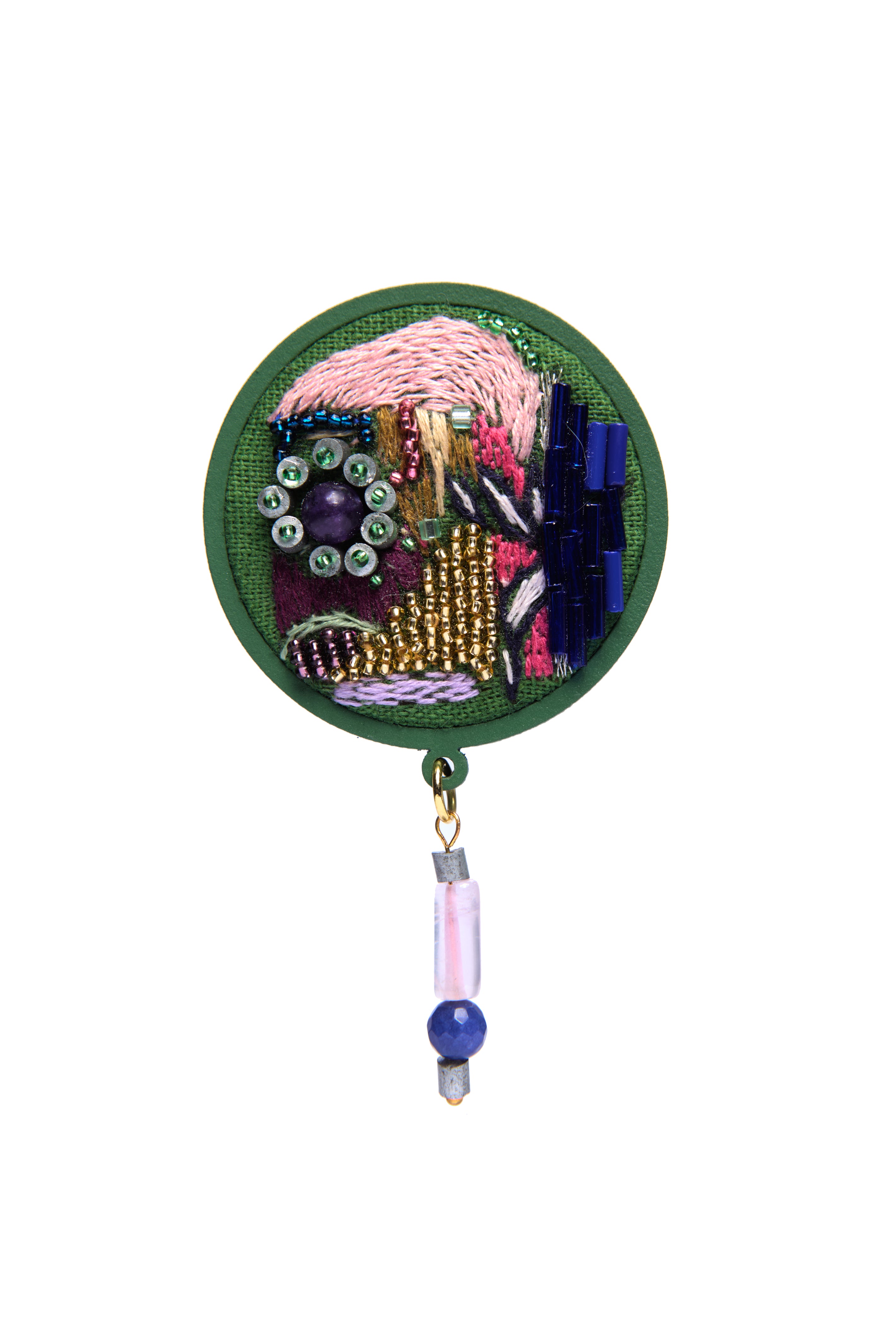 Brinco bordado em linho misto com miçangas, canutilhos, jade e quartzo.