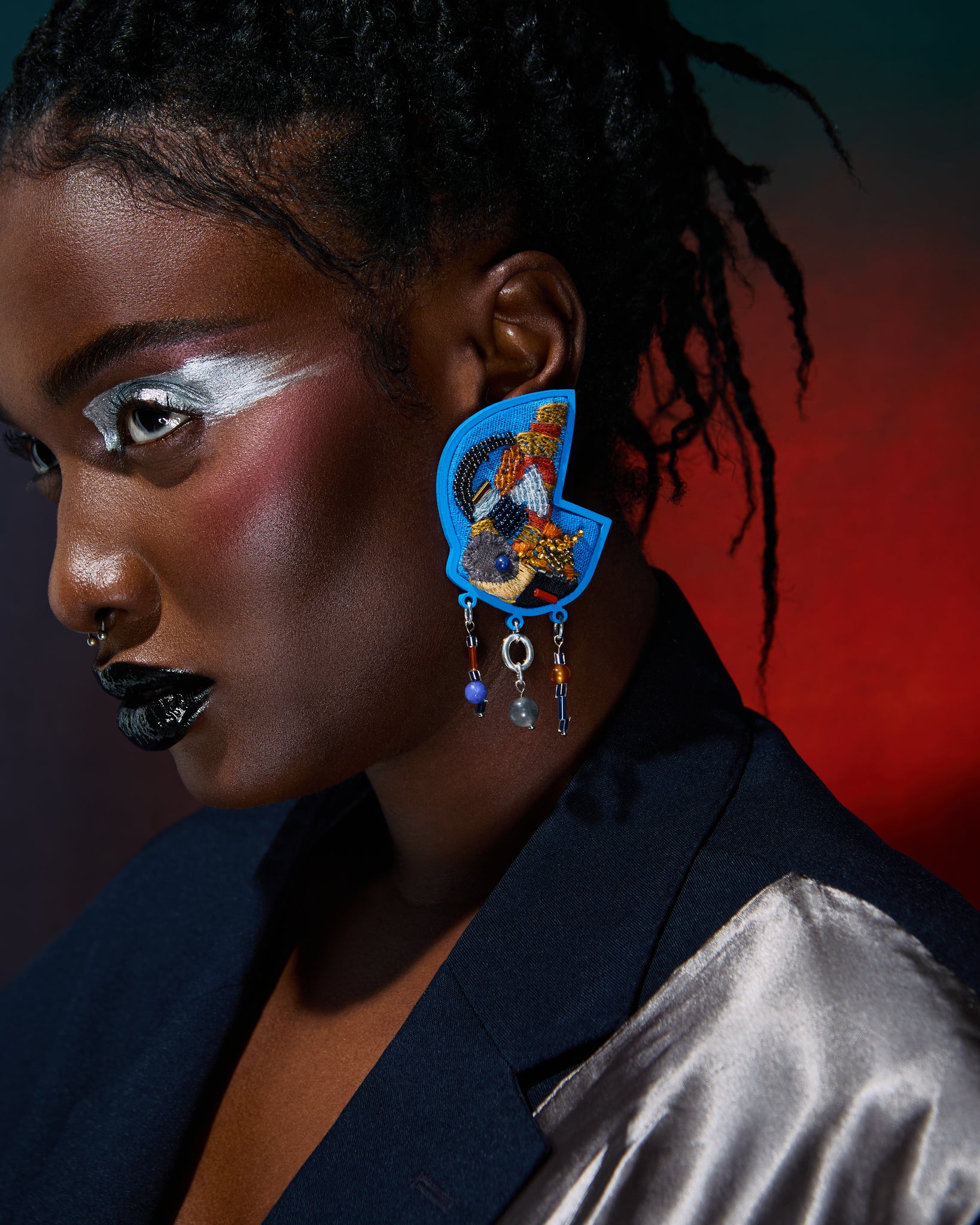 Brinco bordado em linho misto e couro sintético com miçangas, canutilhos, ágata e jade.