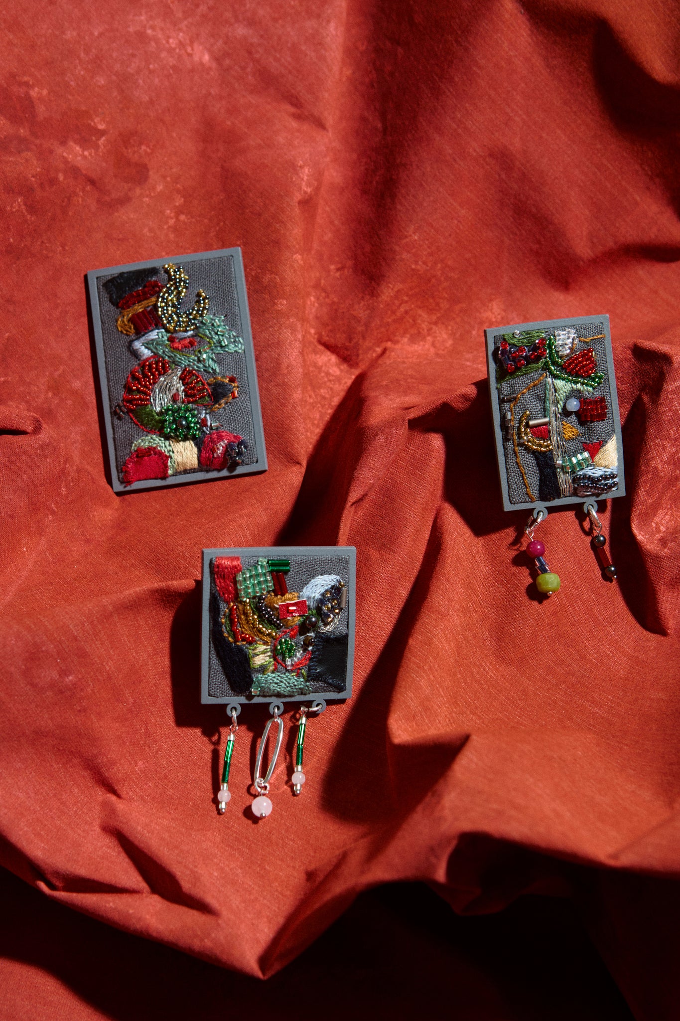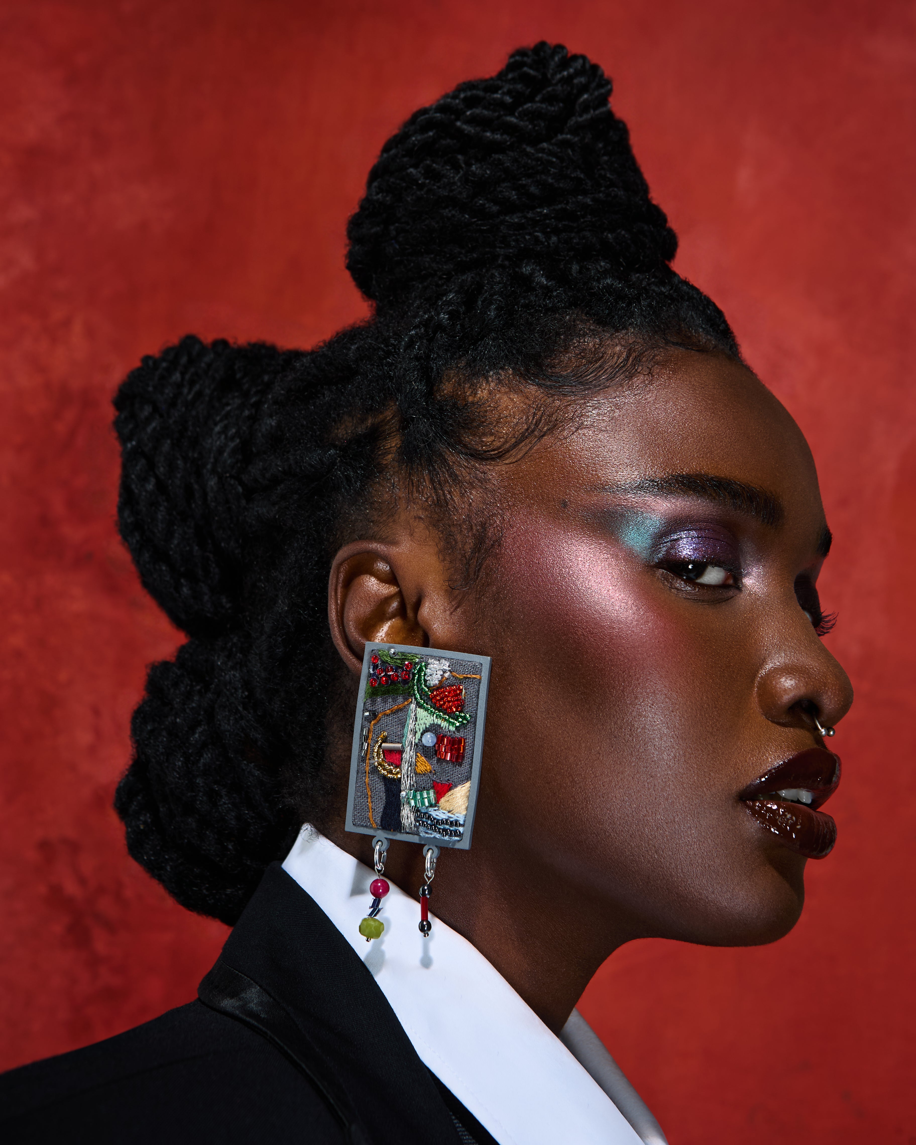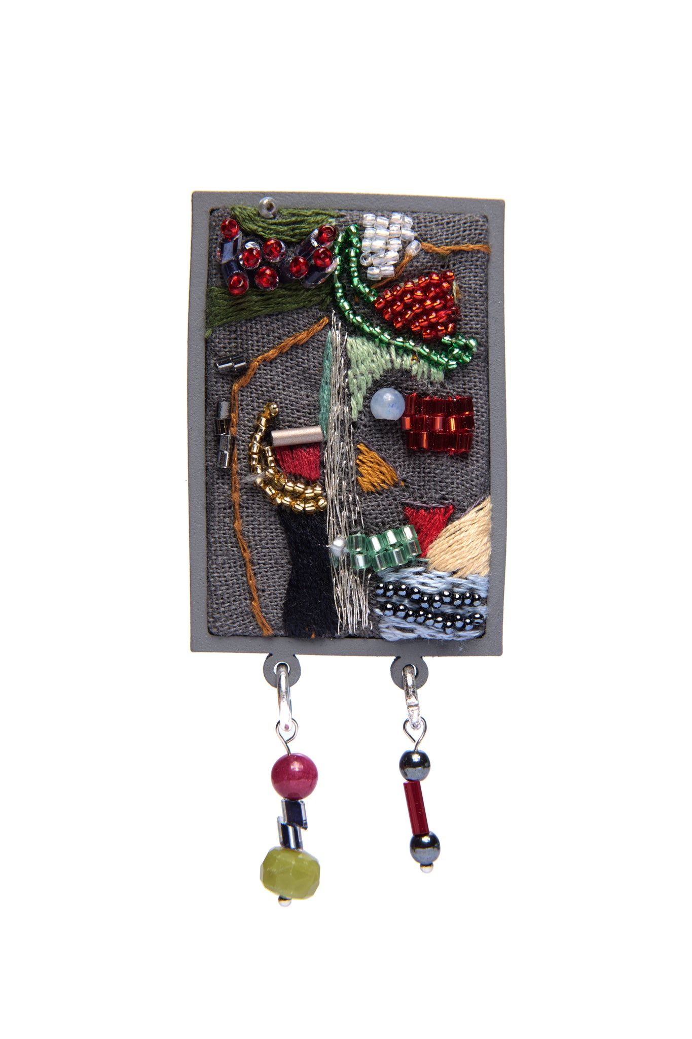 Brinco bordado em linho misto com miçangas, canutilhos, quartzo, jade e jaspe.