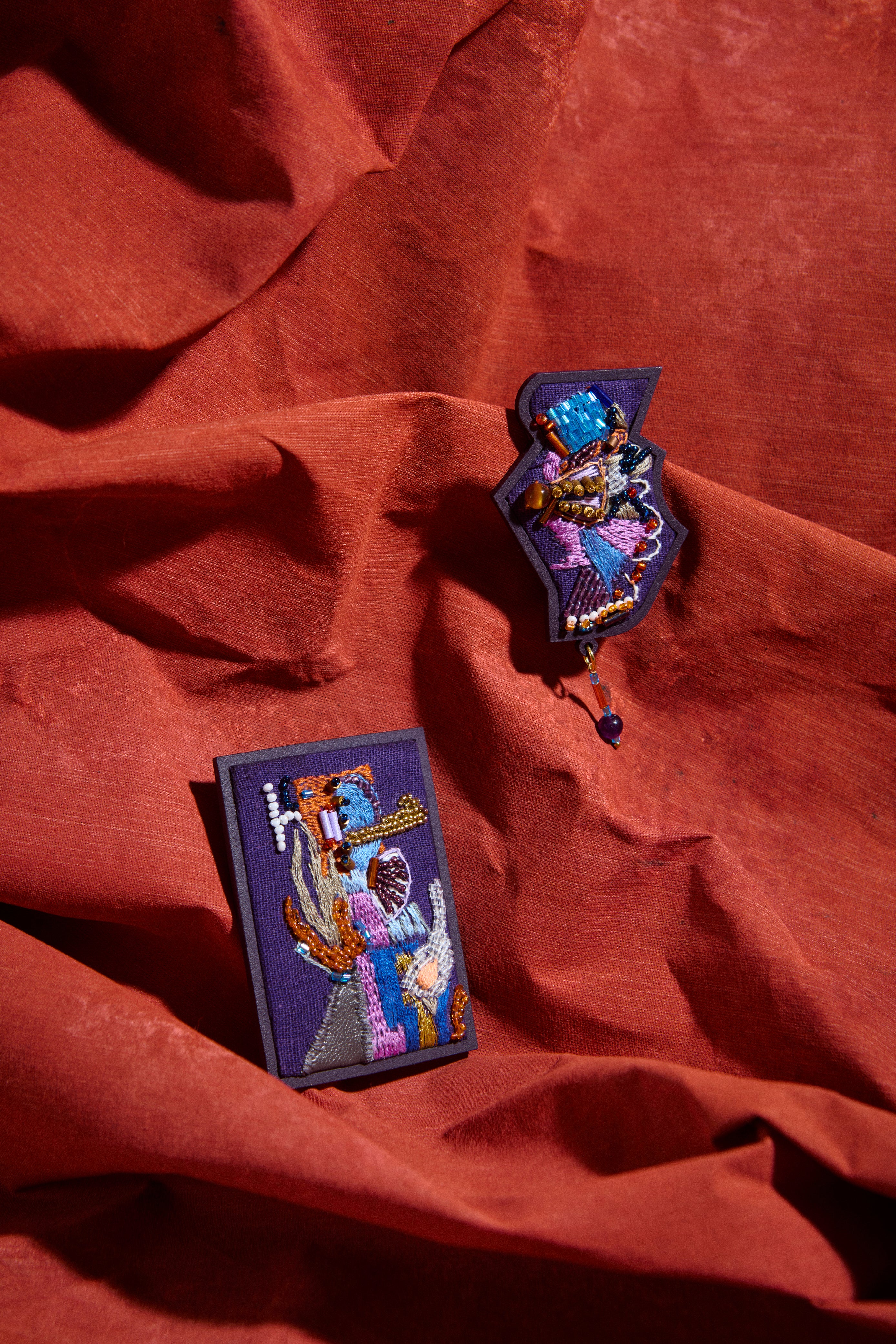 Broche bordado em linho misto com miçangas, canutilhos e ágata.