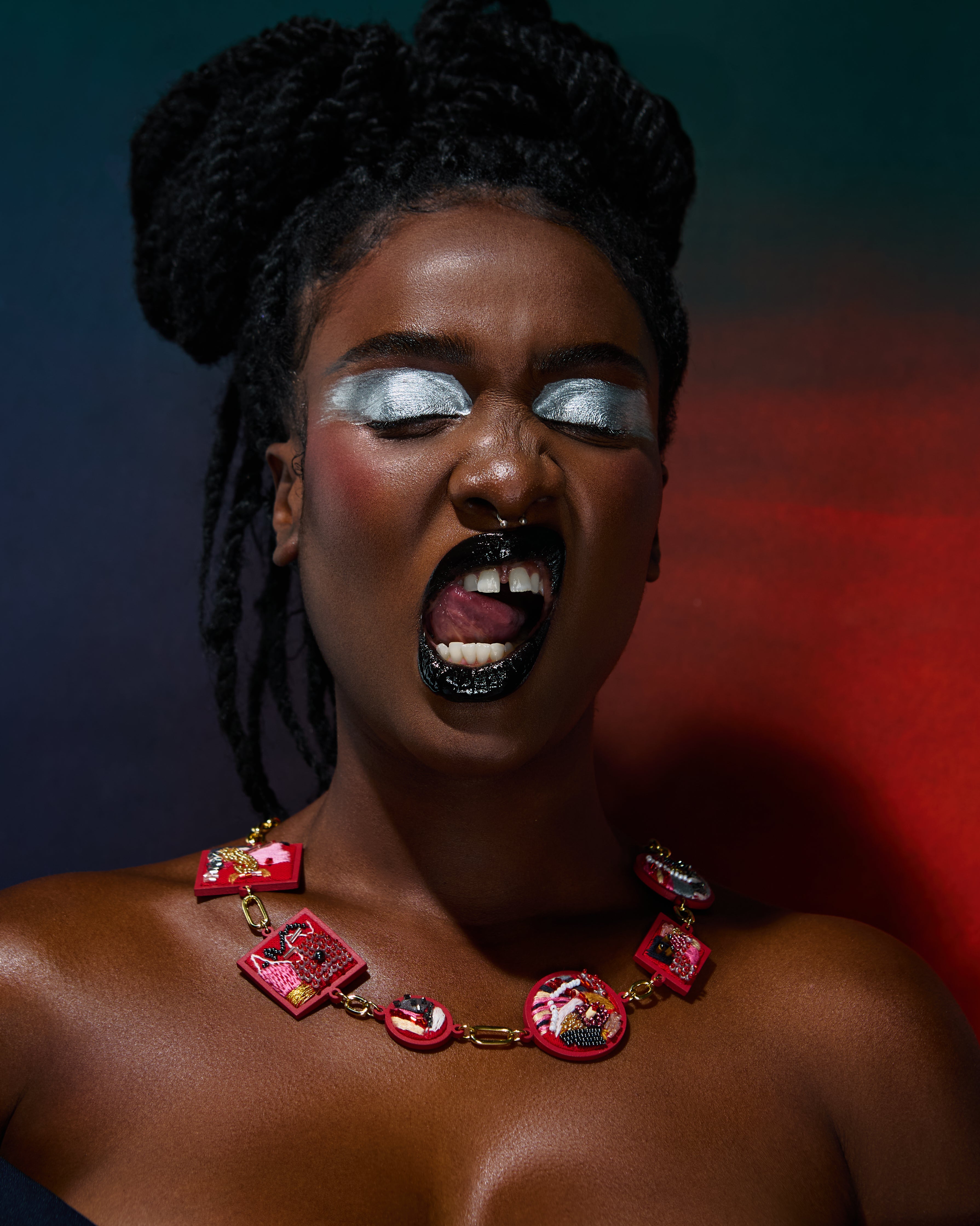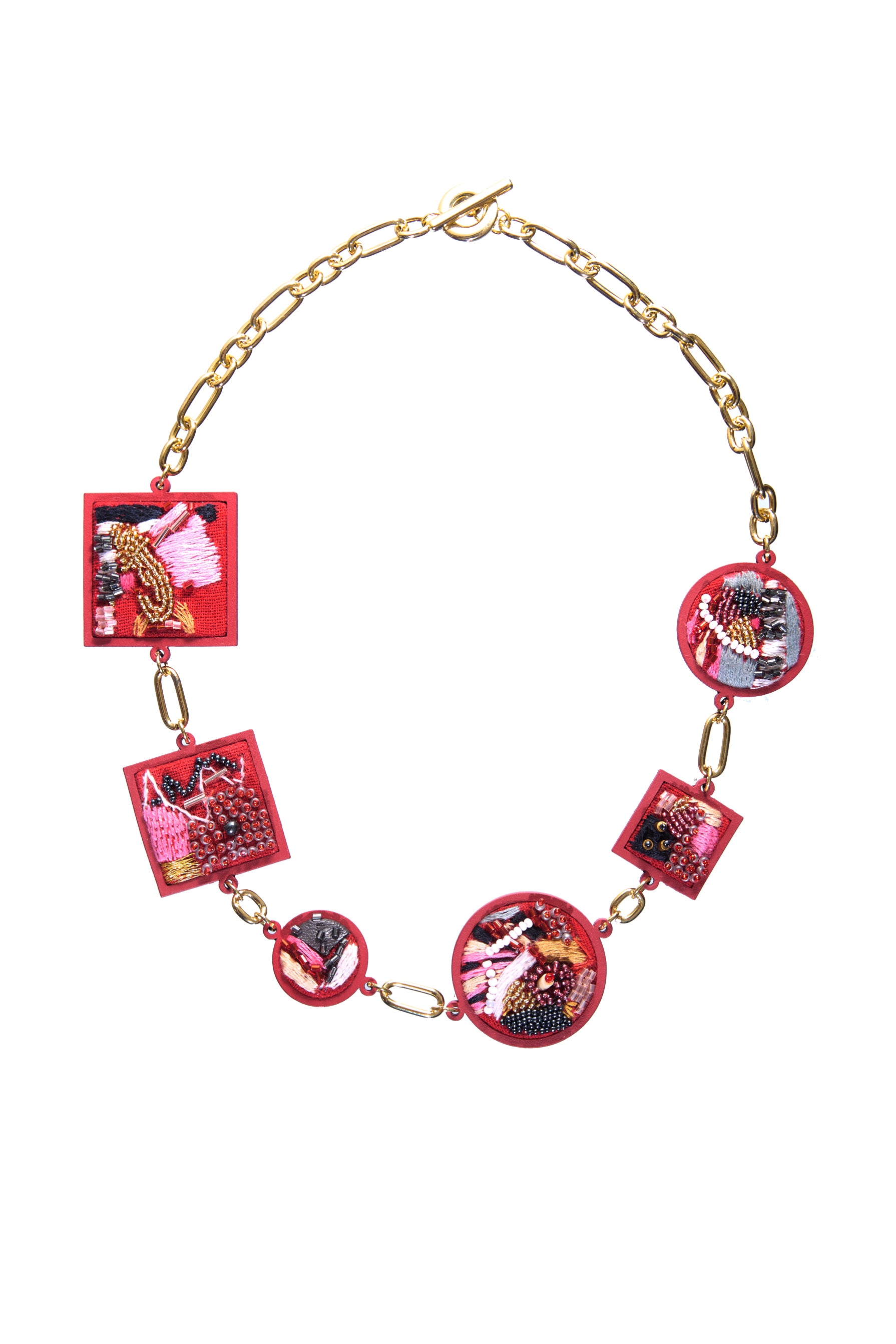 Colar com pingentes bordados em linho misto e couro sintético com miçangas, hematita e canutilhos.